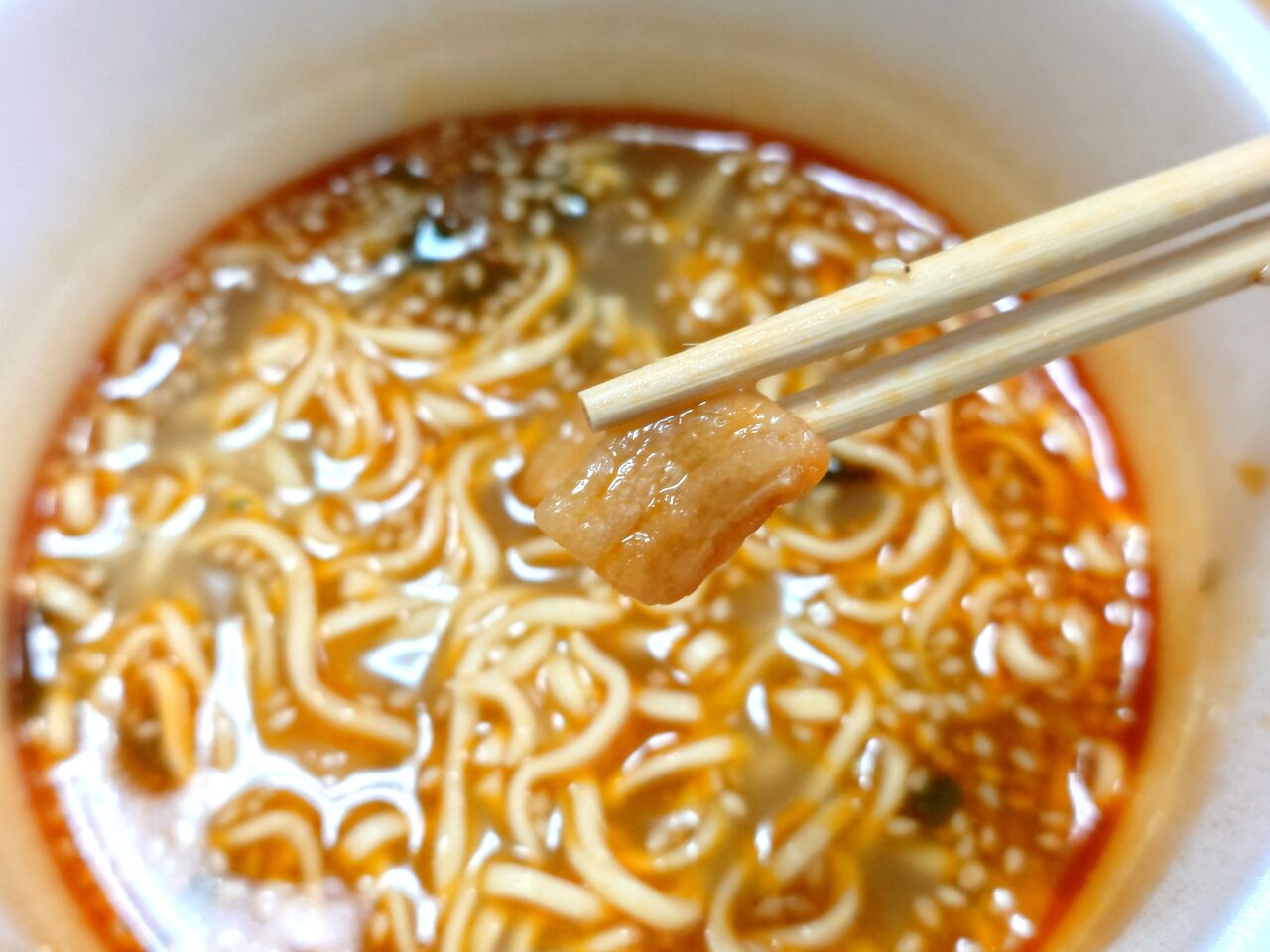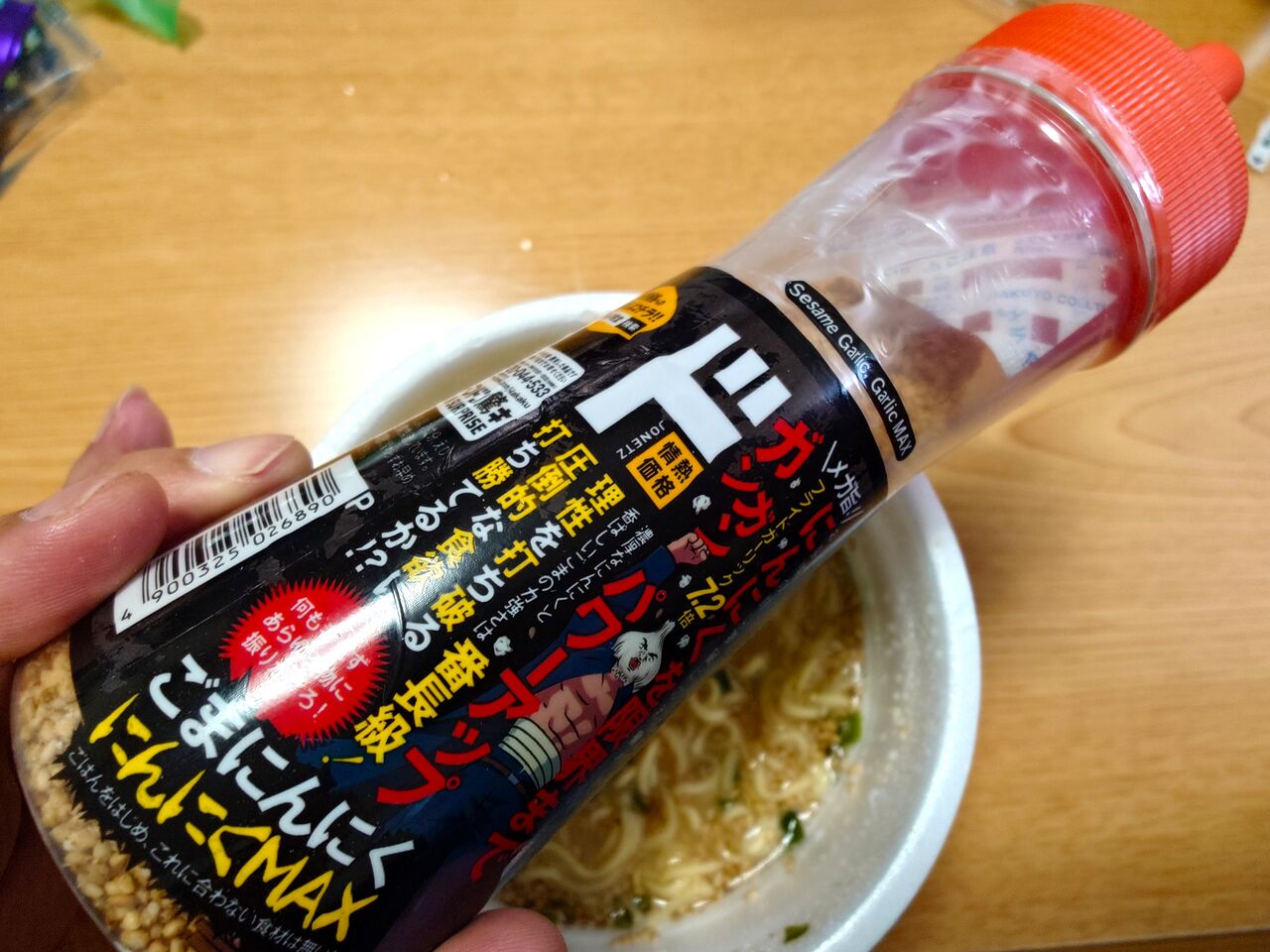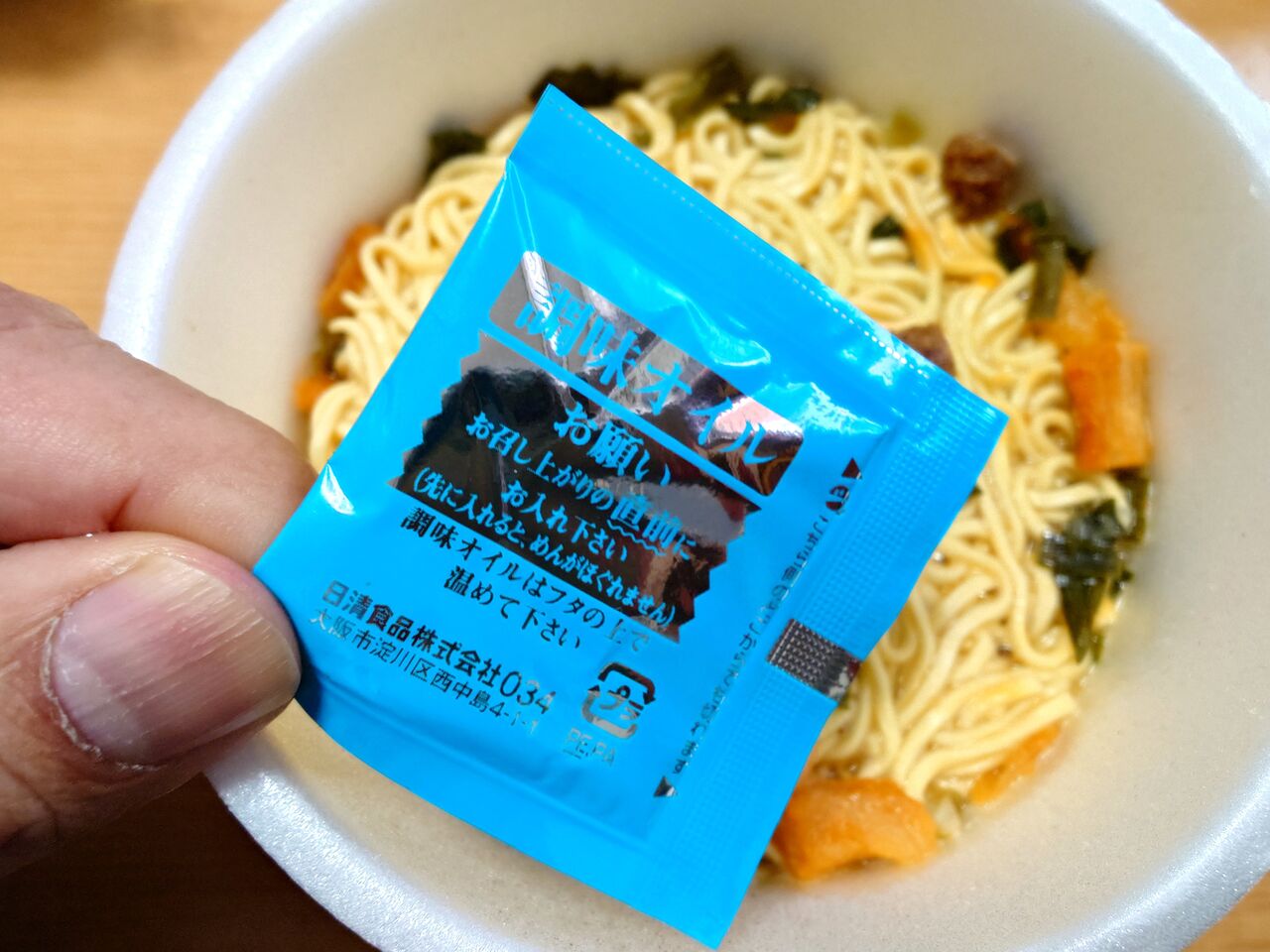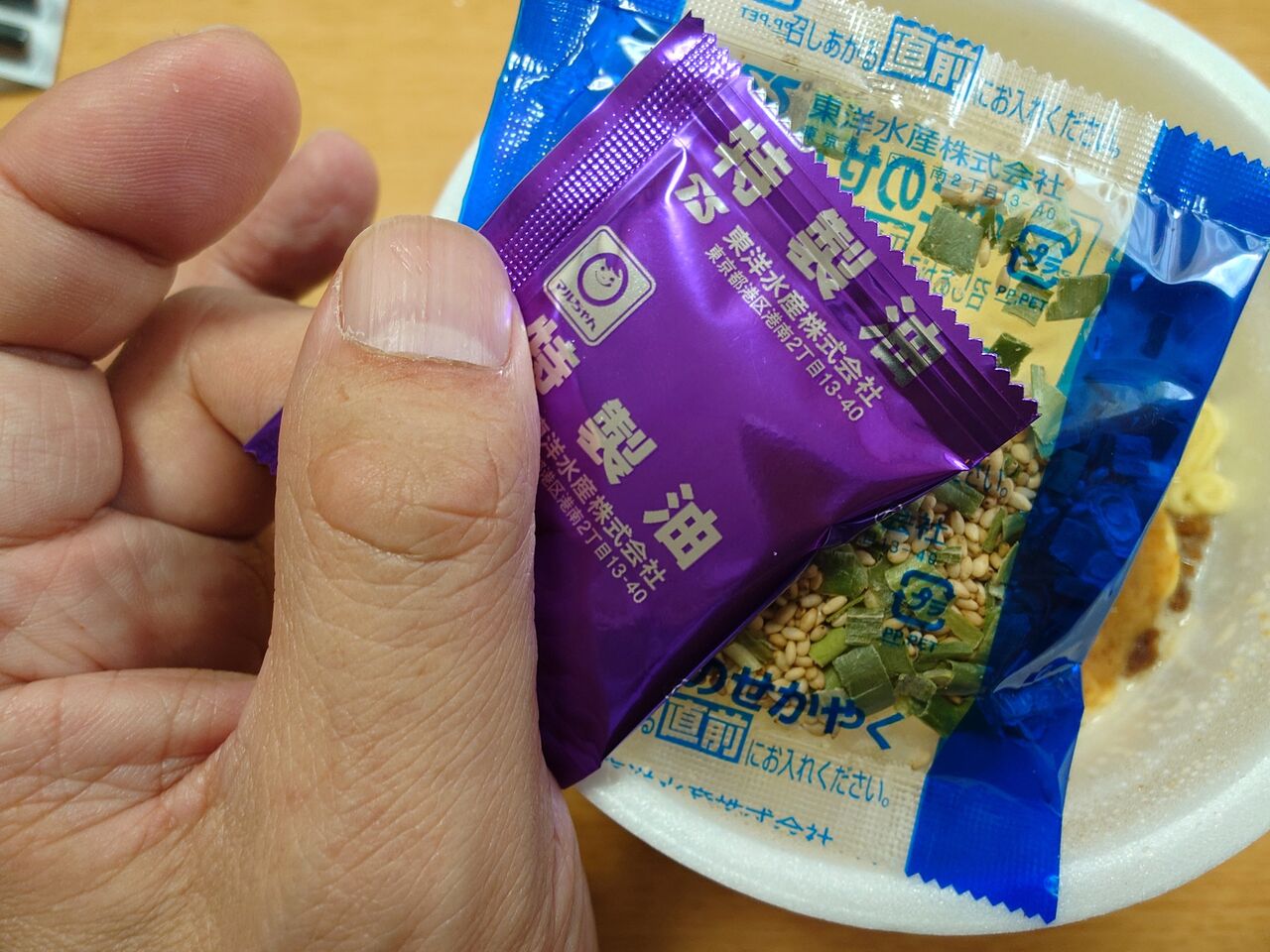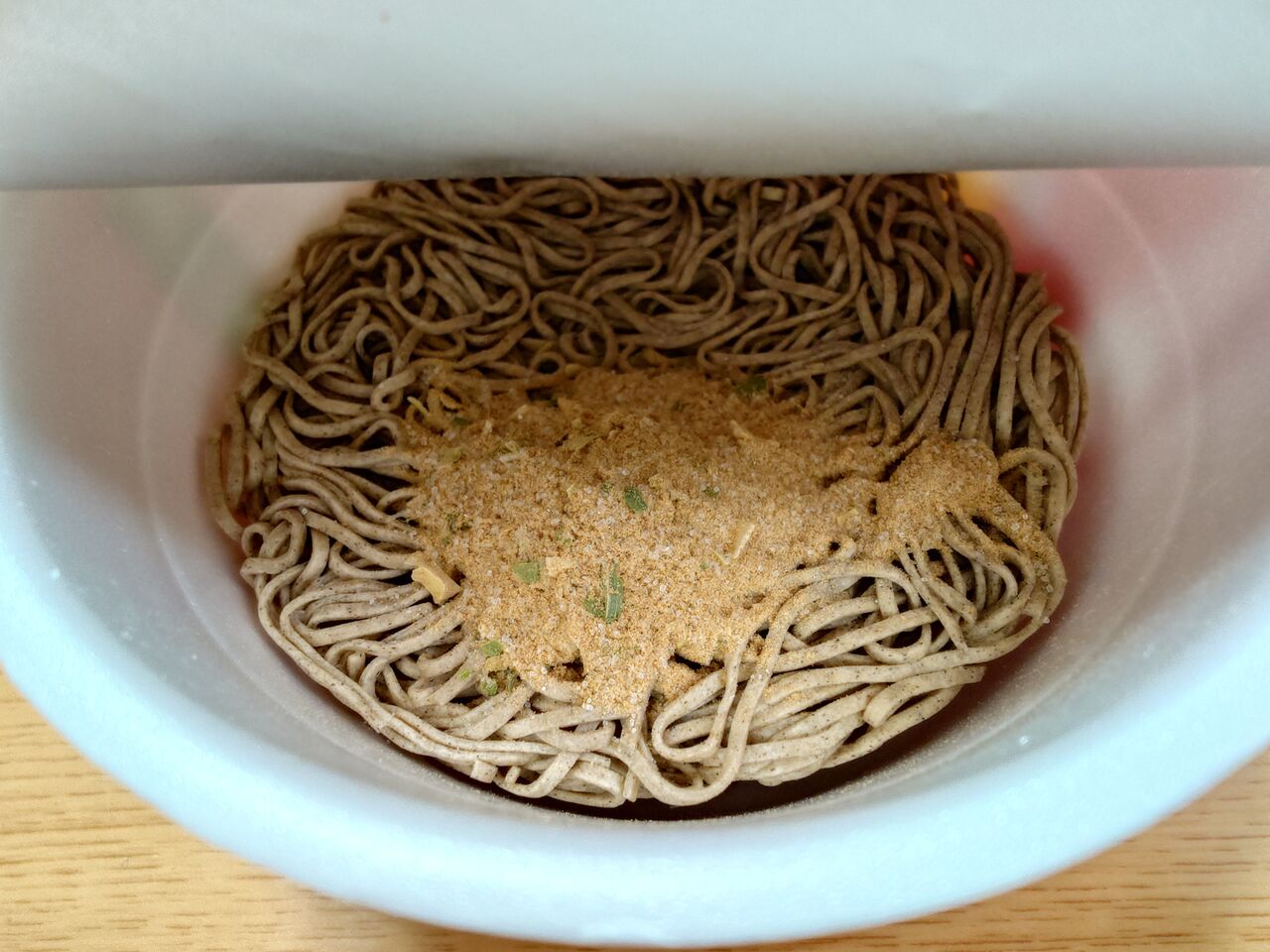 ふたを開け、粉末スープを入れて